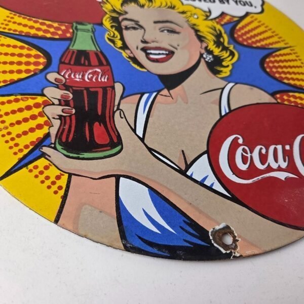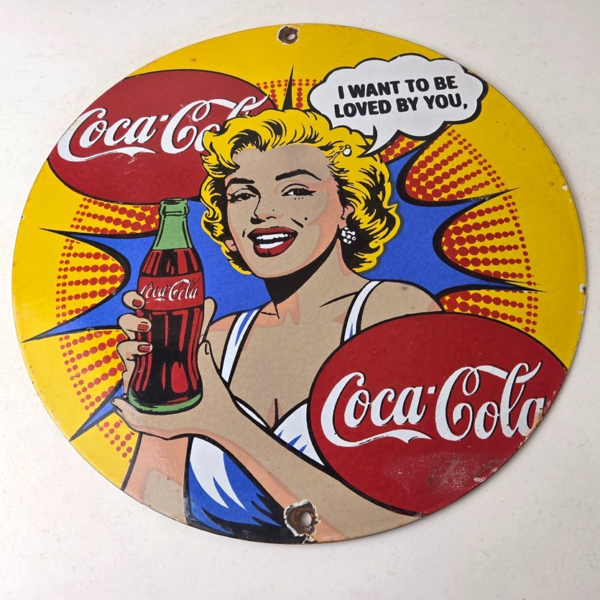 This is a vintage Coca Cola porcelain sign featuring the iconic pinup girl Marilyn Monroe in the center holding a Coca Cola bottle. If you love retro gas and oil memorabilia, or the classic soda signs, you will appreciate this sign. It measures 12 inches in diameter and is in excellent condition.