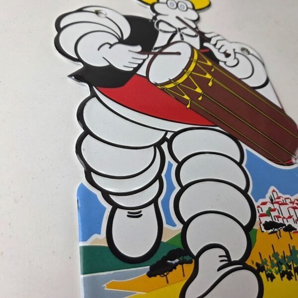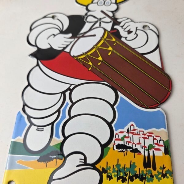 This vintage Michelin Tires porcelain sign features Bibendum man playing the drums. This porcelain automobile tire sign has excellent gloss and colors.