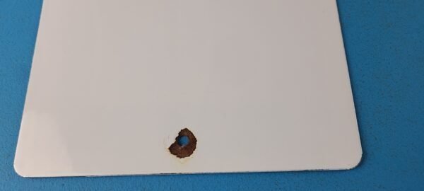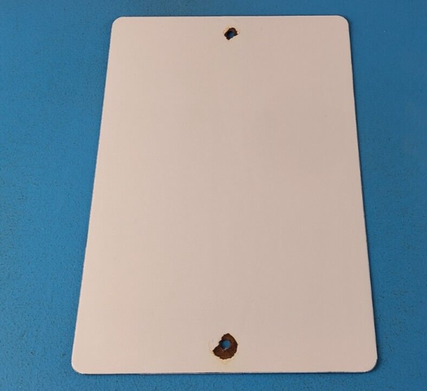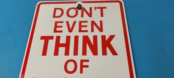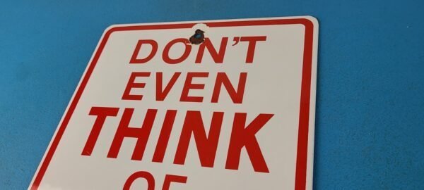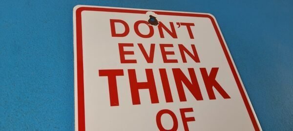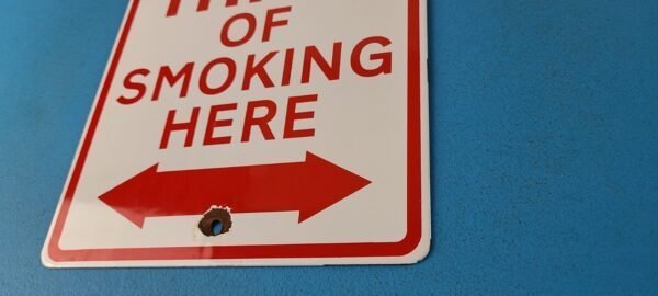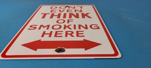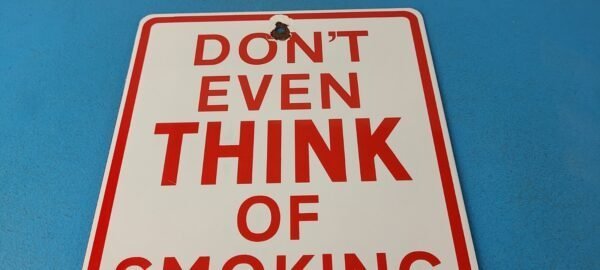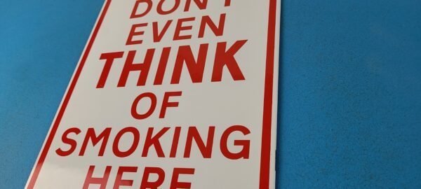 This vintage porcelain sign features the Don’t Even Think of Smoking Here lettering. Measuring 12″ by 8″, this sign is in excellent condition and would make a great addition to any collector’s display. The sign is made of porcelain and has excellent red color and gloss.