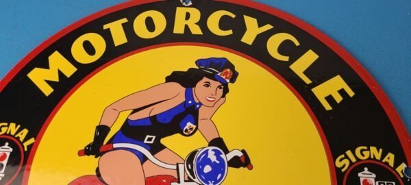 This vintage Signal Gasoline porcelain sign features the iconic Harley Davidson Motorcycles police pinup girl, making it a must-have for any motorcycle enthusiast. The sign is made of porcelain and has the pinup girl biker on a Harley Davidson.